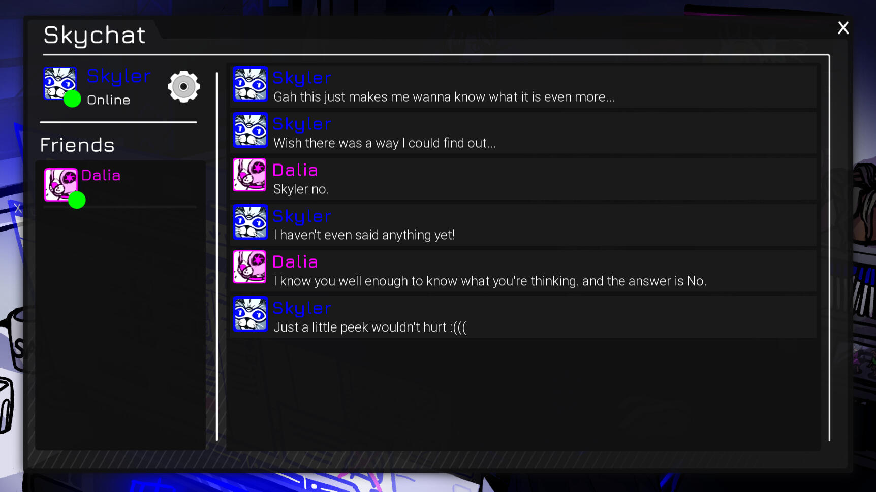 The game also features a chat interface where characters will talk to each other more casually at certain points of the story, and prompt dialogue choices that can contribute to their relationship levels.In addition to the relationship system, there is also a stat system based on the attributes of each of the main sectors in the game. At certain points of the game you can gain these stats, which can contribute to possible endings.