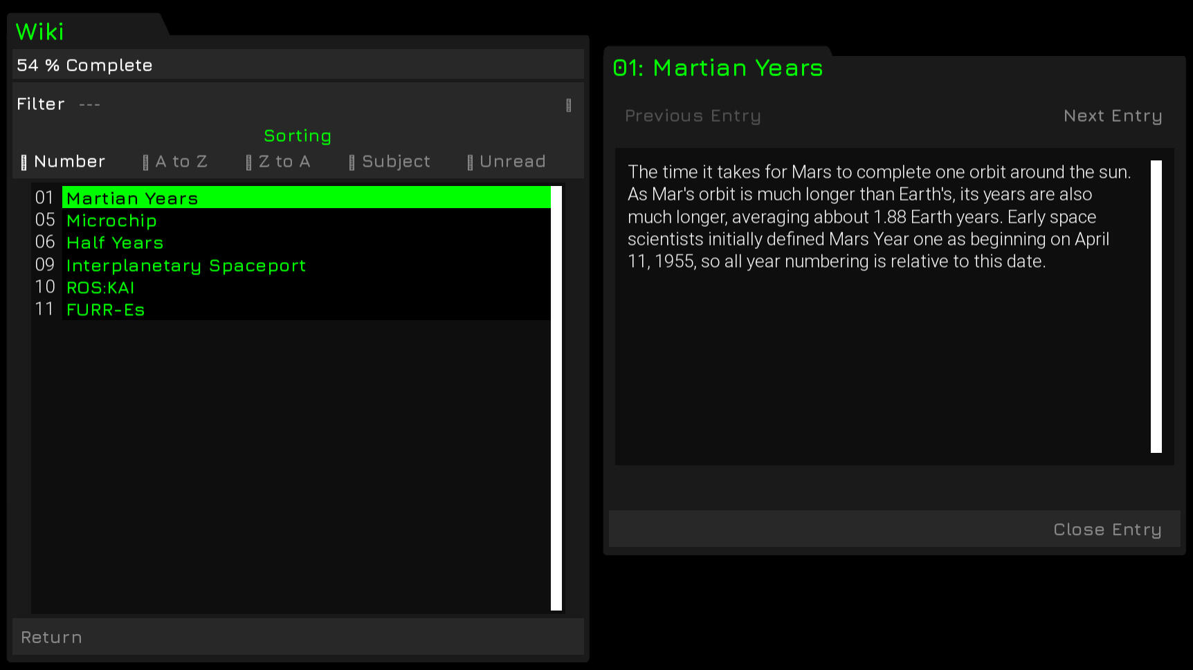 Lastly, the game also features a dictionary system, which gives you more information on the world of OS:TRi, from new technological developments to the everyday differences and difficulties of sustaining life on Mars.